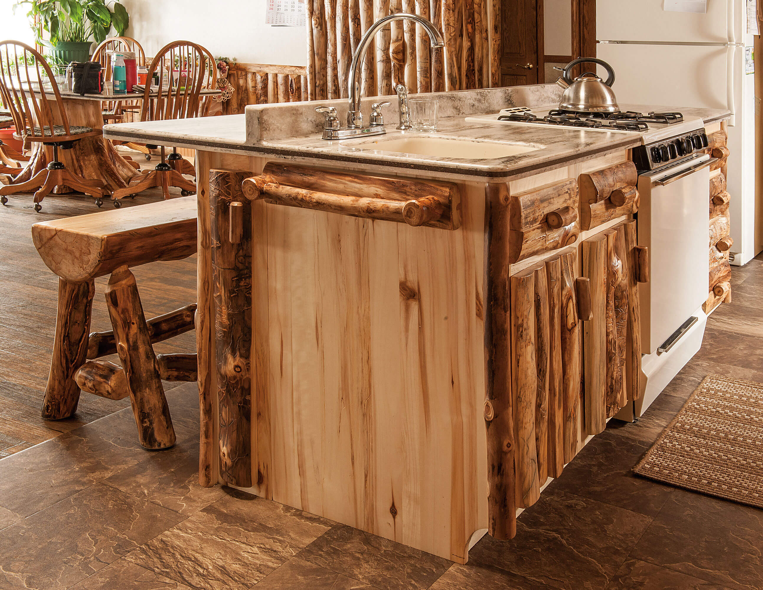 Custom Complete log kitchens are available and custom applications can be applied to any room of your home.
